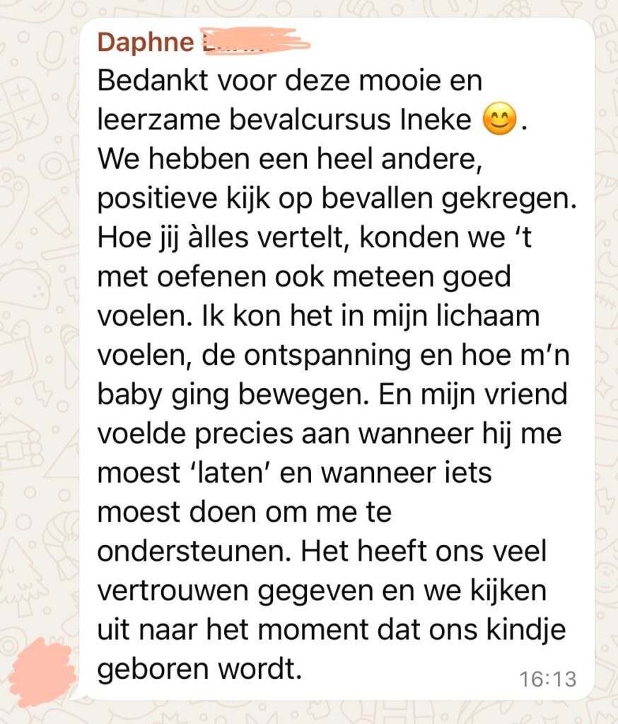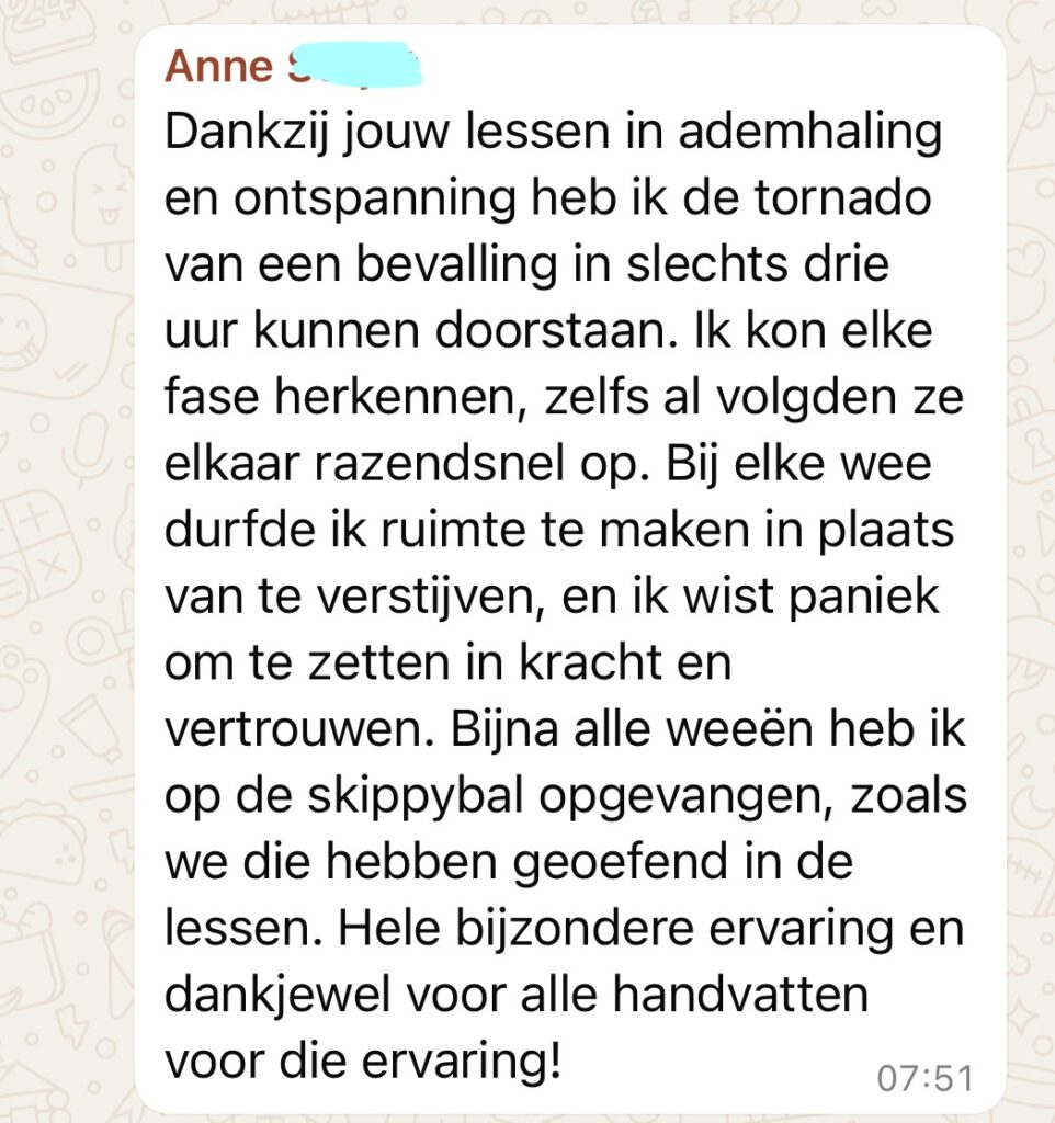In plaats van angst of controle, ervaar je flow: je leert samenwerken met je lichaam en mee te bewegen met de natuurlijke processen van je bevalling. Zelfs tijdens de intensiteit van weeën voel je kracht en ontspanning.