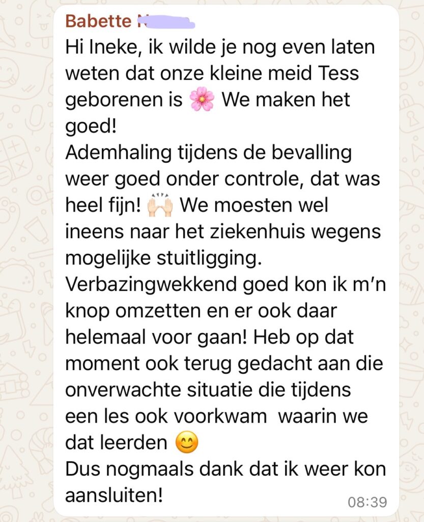 Malou, moeder van twee, heeft tijdens haar zwangerschappen alles wat Ineke leert zelf ervaren. “Ik leerde hoe ik kon meebewegen met de natuurlijke flow van mijn lichaam. In plaats van spanning voelde ik rust en vertrouwen.”